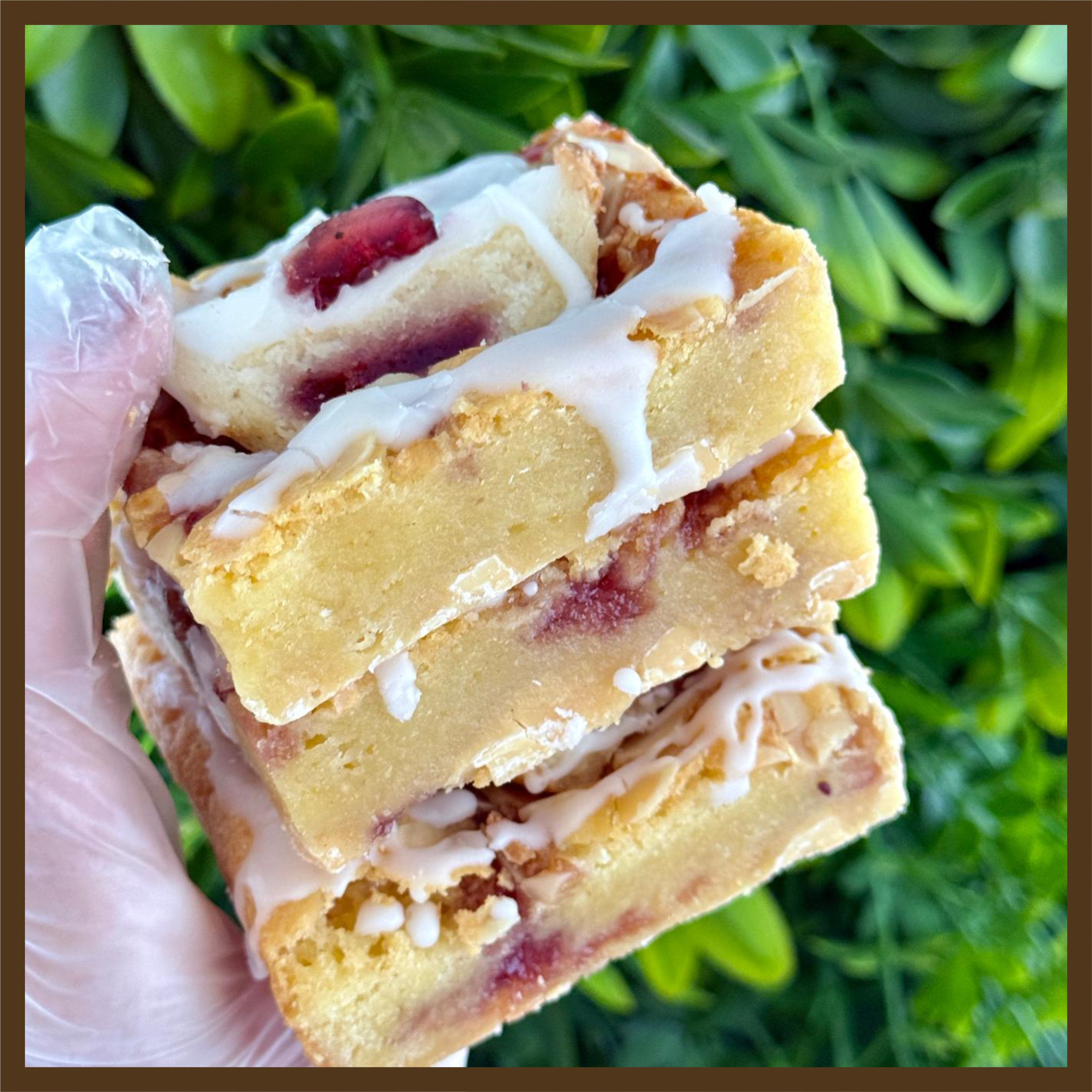 A soft, buttery blondie inspired by the classic Cherry Bakewell tart, filled with sweet cherry pieces, a layer of almond-flavoured filling, and studded with creamy white chocolate for extra indulgence.