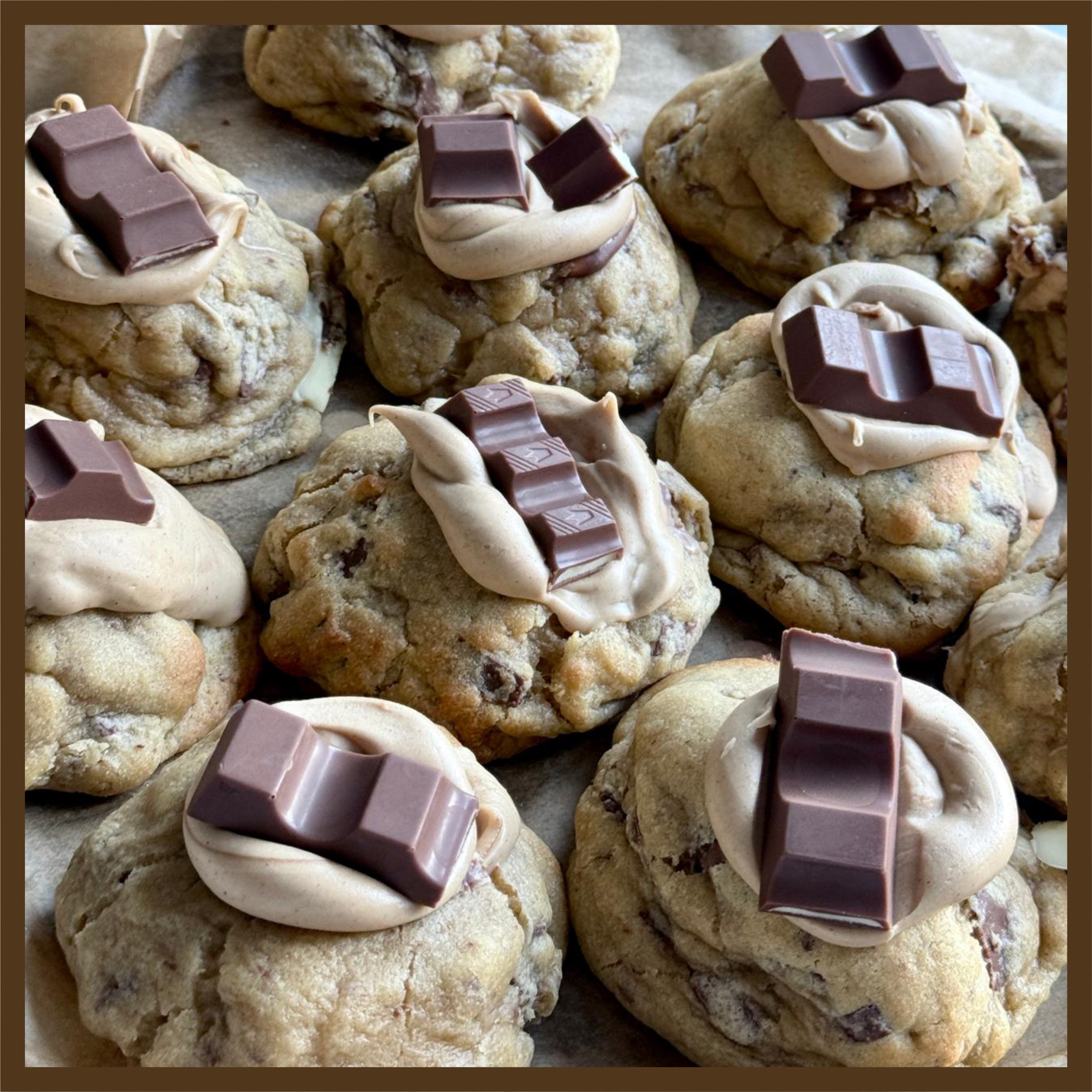 A thick NYC-style cookie packed with milk chocolate and Kinder pieces, filled with a smooth hazelnut “Kindersella” sauce for a rich and creamy centre inspired by Kinder Bueno flavours.